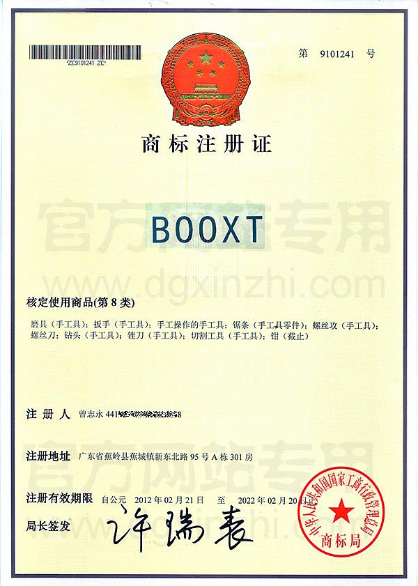 您当前的位置:首页 > 了解豹发力 > 荣誉证书 >BOOXT第8类商标注册证