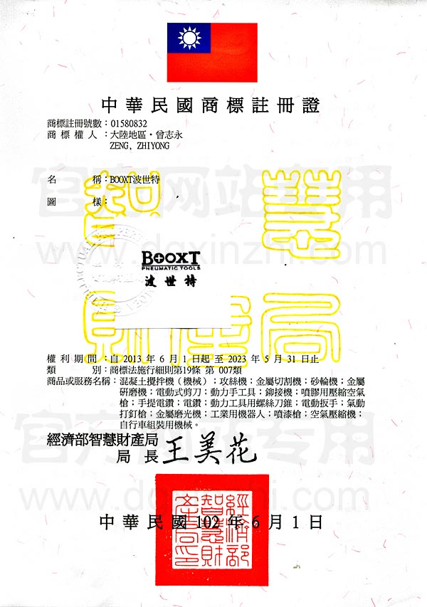 此文关键词:BOOXT台湾注册证第7类,风批公司荣誉证书